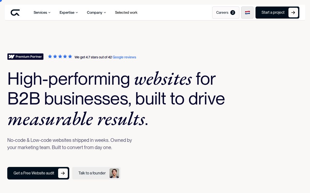 Groove Digital is a Webflow Premium Partner based in Amsterdam that designs, builds, optimises, and scales high-performing B2B websites and webshops using no-code and low-code tools. The agency operates on a proprietary Sprints & Recipes™ framework, breaking engagements into focused two-week sprints to deliver predictable, phased results. Services span brand identity, UX design, website design, Webflow and Shopify development, CRO, SEO, API integrations, business automation, photography, videography, and lead generation. The agency also offers GrooveCare for proactive website management and 24/7 support. It holds Certified Partner status with Shopify, Zapier, and Typeform, and reports a 4.7-star rating across 42 Google reviews.