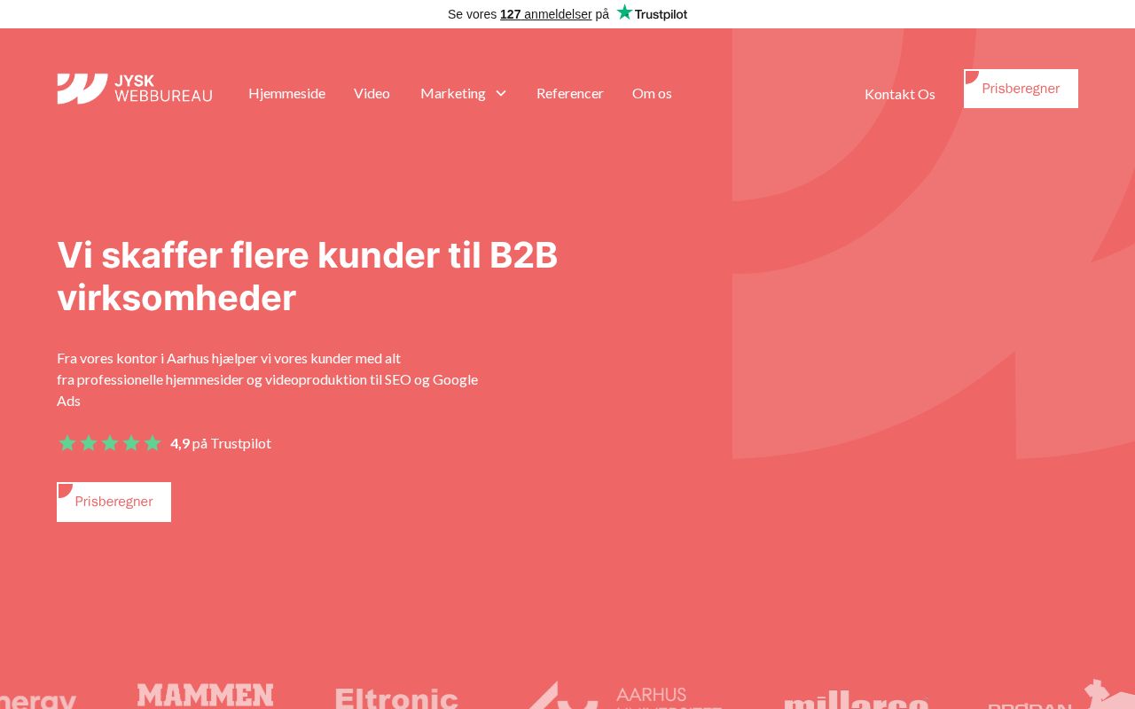 Jysk Webbureau is a Danish digital agency based in Aarhus that serves B2B companies. The agency offers web design and development using Webflow, video production, SEO, Google Ads, LinkedIn marketing, and copywriting. It follows a structured four-step process covering kickoff, production, revision, and delivery. The agency positions itself as a close-contact, hands-on partner and holds a 4.9 rating on Trustpilot. Clients include businesses across manufacturing, food production, engineering, and professional services sectors. A price calculator tool is available on the website for prospective clients to estimate project costs.