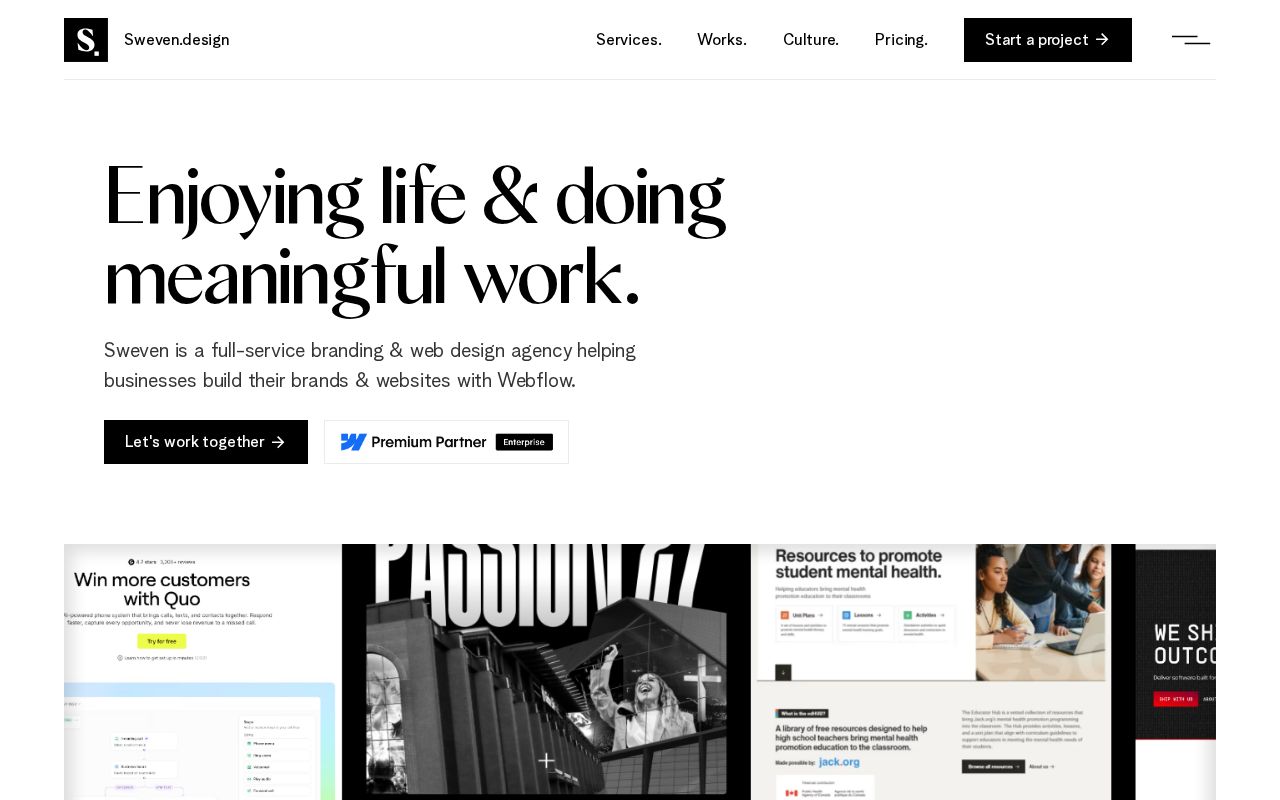 Sweven is a full-service branding and web design agency based in Texas, operating fully remote. The agency specializes in brand identity, web design, Webflow development, and website migration—particularly from WordPress to Webflow. Sweven works with a broad range of clients spanning healthcare, SaaS, nonprofits, real estate, and more. The team emphasizes collaborative creative processes, long-term client relationships, and quality execution. Named team members include Darren and Keith. The agency's portfolio includes dozens of clients across industries, with featured case studies for organizations such as Turquoise Health, Jack.org/edHUB, ClickTime, Passion, and Renewed Vision.