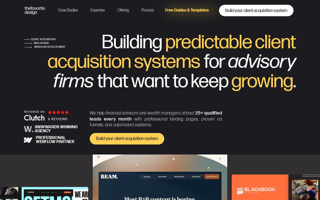 The Favorite Design is a Montreal-based design and digital marketing agency specializing in client acquisition systems for financial advisors and wealth management firms. The agency offers web design, Webflow development, landing page creation, targeted ad funnels, and marketing automation. It positions itself as a fractional marketing team, helping advisory clients attract qualified leads through conversion-focused landing pages, automated follow-up systems, and ongoing campaign refinement. The agency holds Awwwards recognition and Professional Webflow Partner status. Notable projects include sales funnel development for pclub.io, resulting in a 16.73% MRR increase, as well as website builds for CoPilot AI, Beam Content, and BlackBook Investments.